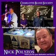 He was dedicated to Charlotte Blues Society and as a Board Member at Large, we called him "The Keeper of the Big Bang" Nick made sure our Drum & Cymbals are available for every Blues Sunday event, helped to work the door on our Blues Sundays, and was one of the first to volunteer for outside events, whether it was Taste of Charlotte, or our merch/membership table at Blues shows around town. He was also our official time-keeper for our Blues Challenge every year.